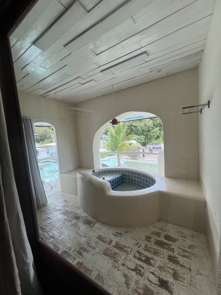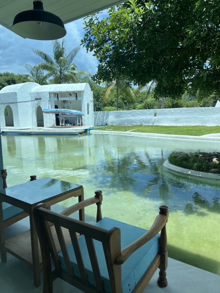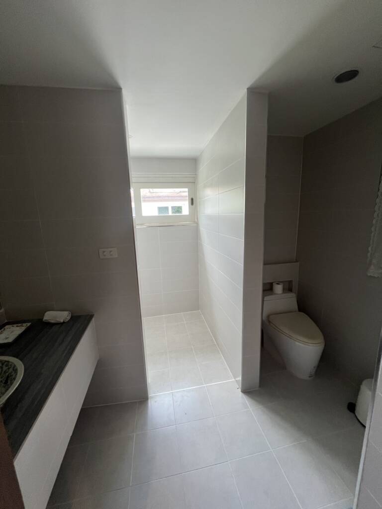 White deluxe room on first floor by the river. River access and paddle a boat out of the room. For 3 adults Price per room : 5,000 Baht Number of guests. 1-3 adults. Area (sqm) 42