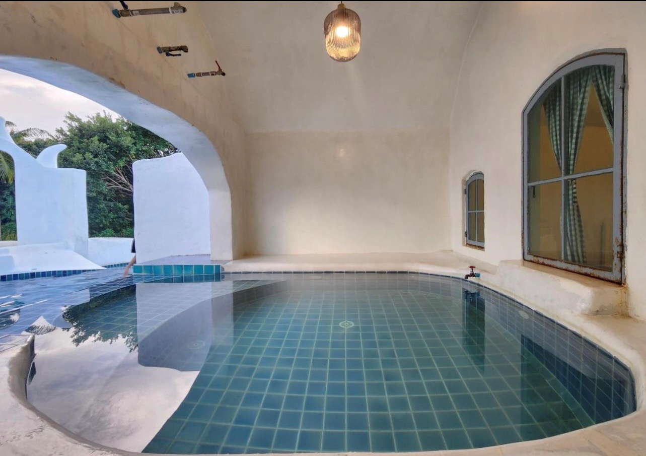 White family room with bathtub on first floor by the river and next to the swimming pool. One large bathroom and a large pool in the room. For family 5 adults. Price per room : 8,000 Baht Number of guests. 1-5 adults. Area (sqm) 96